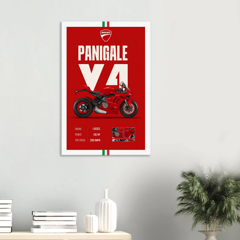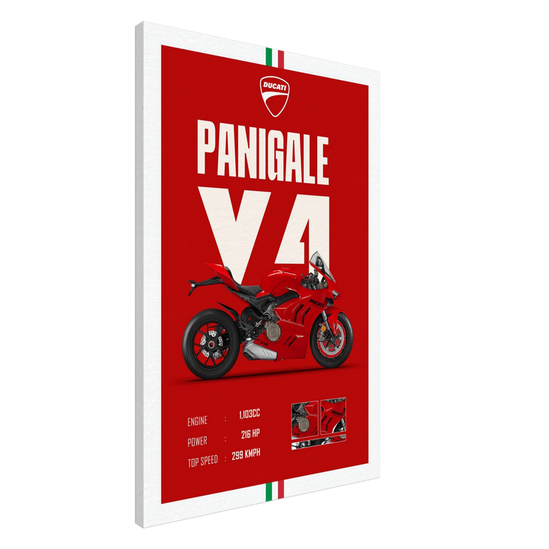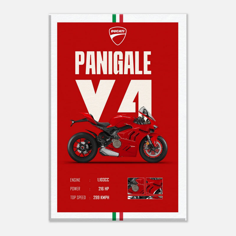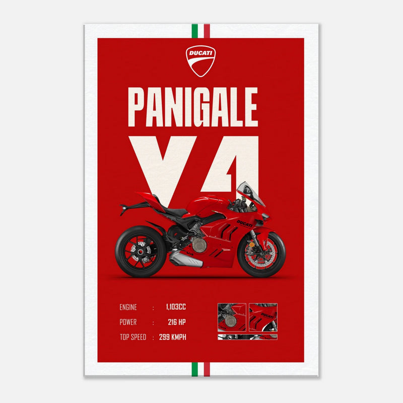 At the center stands the Ducati Panigale V4 in its signature racing red — a symbol of engineering excellence. Every detail is captured in crisp clarity: the sculpted fairings, aerodynamic lines, and high-performance stance radiate adrenaline and craftsmanship. Below, the technical specs complete the artwork with an elegant nod to Ducati’s engineering prowess.